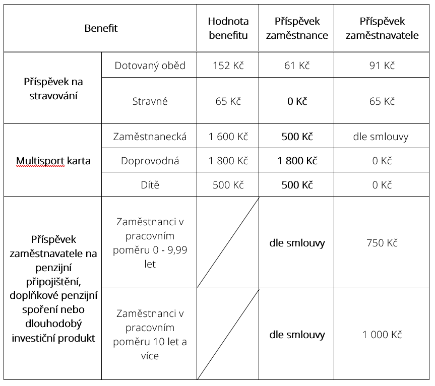 Uvedené benefity náleží zaměstnancům po uplynutí zkušební doby (byla-li sjednána) a zaměstnancům, kteří nejsou ve výpovědní době nebo neuzavřeli dohodu o rozvázání pracovního poměru, pokud u jednotlivých benefitů není uvedeno jinak.